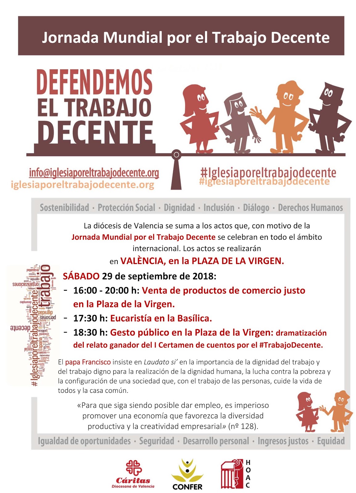 Algunas de las entidades firmantes de la Iniciativa Iglesia por Trabajo Decente con presencia en Valencia: Cáritas, la Hermandad Obrera de Acción Católica, junto al Servicio Jesuita a Migrantes, y gracias a la colaboración de entidades de Comercio Justo, han organizado un mercadillo para incentivar el consumo consciente de productos libres de explotación laboral, una Eucaristía en la Basílica de la Virgen de los desamparados y un acto público (cuentacuentos) en la plaza.